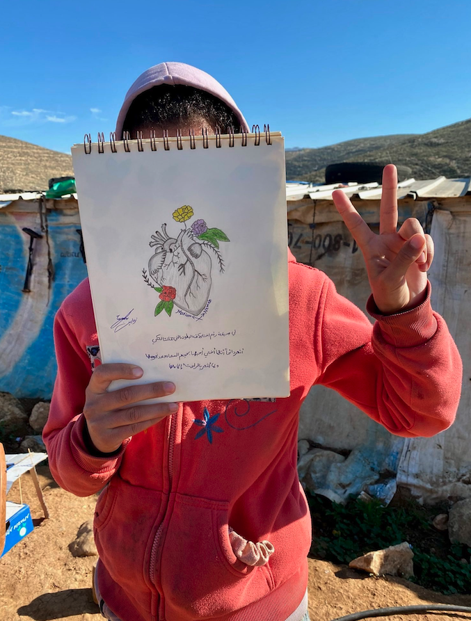 A Palestinian young artist in the West Bank holds up one of their drawings: an anatomical heart with a message in Arabic.